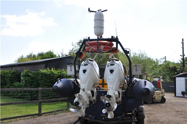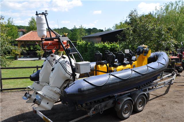 Halmatic Artic 22 Rigid Hull Inflatable Boat on a Bramber Twin Wheel Multi Roller Coaster Trailer with Brand New Wheel Bearings Fitted All-round , Boat is 2002 and Ex Police so need’s no introduction, Also used by the Military – Coastguard – RNLI etc, Comes with Twin Evinrude E-Tec 130hp Engines with Viper Stainless Steel Props and i-command Gauges Bought Brand New in 2012 which monitor Everything, One Engine has 425 Hours and the other has 426 Hours, Boat has been Clocked at 50mph They both Come Fully Serviced from an Evinrude Main Dealer with a Computer Printout of Both Engines including New Oils and Filters, New Impellers – New Thermostats, Both Engines have been thoroughly gone over and are ready for use, A Frame with Radar Blipper, Nav and mast lights, Life Buoys, Towing Brackets, Throw Line, Search Light, Seating for 5 with Under Seating Lockers, icom Radio, Raymarine and Lawrence Depth Sounder and Chartplotter, Plastimo Compass, Twin Tanks, Twin Batteries, All Fused properly, and of Course everything is Done as you Would Expect on a Boat of this Quality, MCA Registered, Comes with everything except Blue Light, ideal for Commercial use, any enquiries 07768 840230, Delivery Arranged, Price is Plus Vat at 20% which is Fully Reclaimable if your Registered