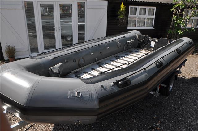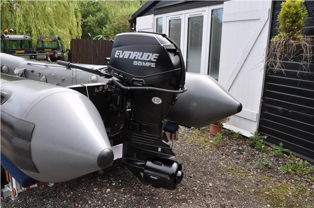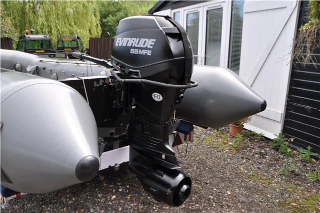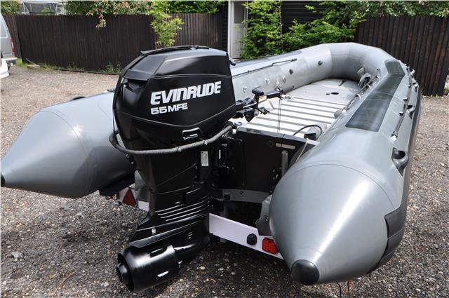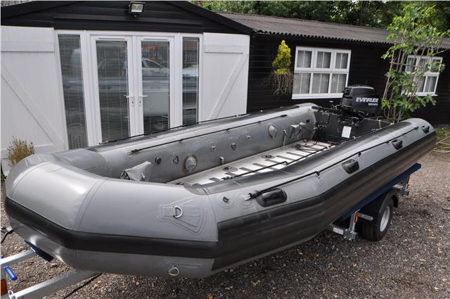 Zodiac Milpro WB525 Work Boat in Grey and Black Hypalon Commercial Spec very heavy Duty, Not All Zodiacs are by Milpro Check the Serial Plate, These are the real Deal with Alloy Floor and inflatable keel, 5 Inflatable Chambers with pressure Relief Valves, they Come with Bags to put them in and store if you wanted to, I have 2 Both on Brand New Trailers Bunked for inflatables BUT only one Engine, The Engine is a New Evinrude 55hp MFE ( Multi Fuel Engine ) that is Somewhat Special, in Fact very Special, you can get parts from Evinrude for the Engine but hear all about them on you tube, These are only available to SAS SBS special Forces, they are fired out of Submarine torpedo types or dropped from helicopters into the water, they can be fully submerged and re started with no problem, they can run on Petrol Diesel if they have to or Jack Daniels, Just do your homework before contacting me as this is not the norm, any enquiries 07768 840230,